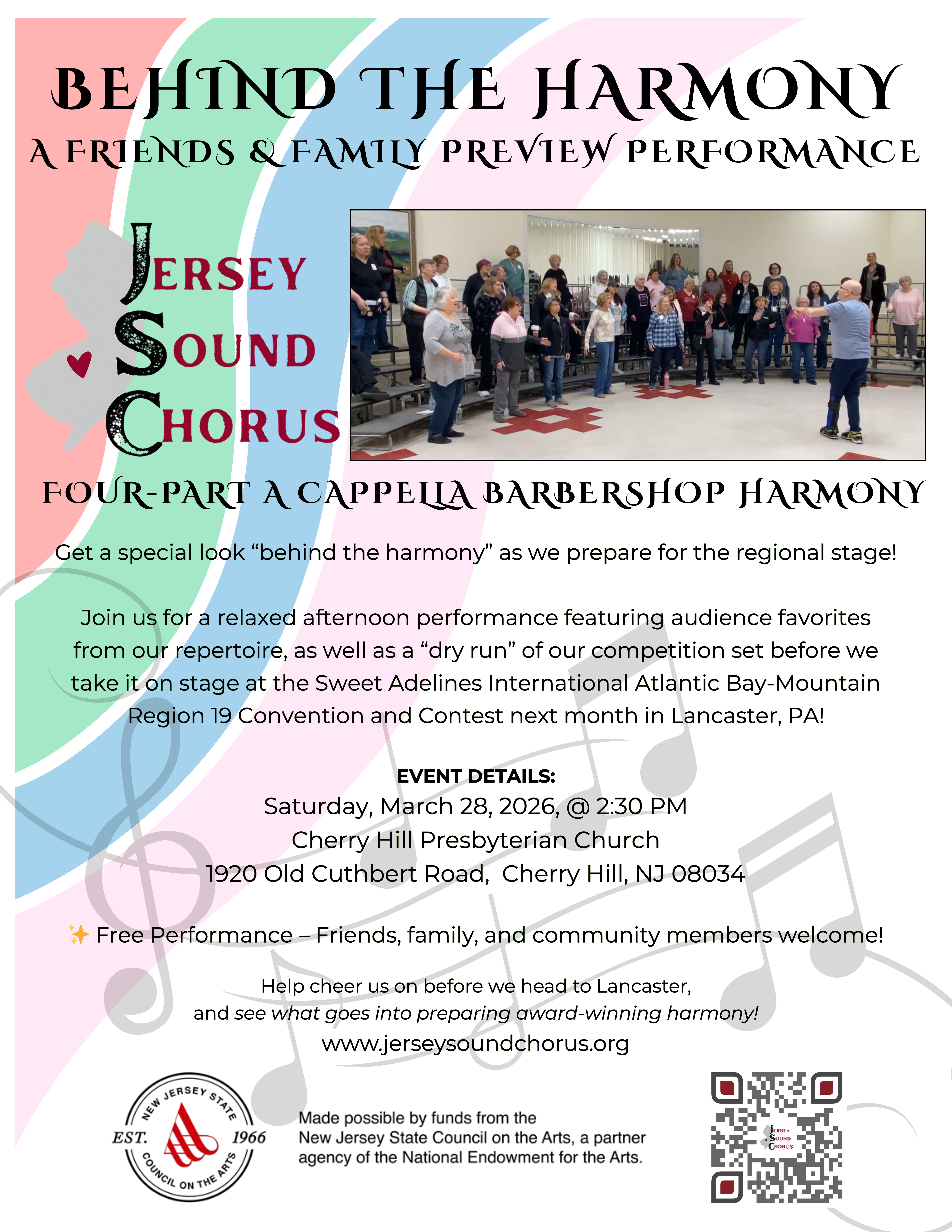 Join us for a relaxed afternoon performance featuring audience favorites from our repertoire, as well as a “dry run” of our competition set before we take it on stage at the Sweet Adelines International Atlantic Bay-Mountain Region 19 Convention and Contest next month in Lancaster, PA!